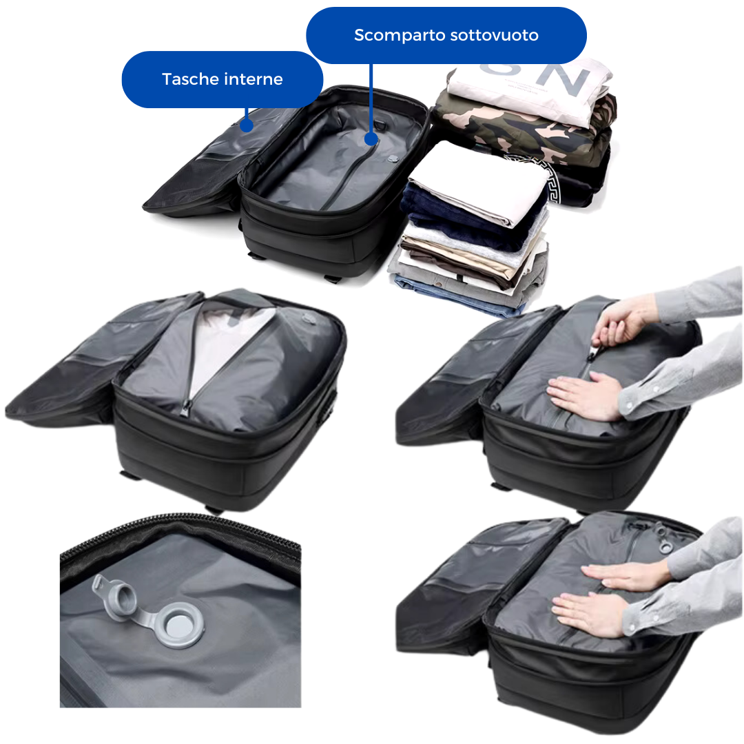 Con il sistema sottovuoto comprimi gli indumenti in pochi secondi; disponi i vestiti nello zaino, collega la pompa elettrica ed il gioco è fatto, ottimizza lo spazio e azzera i costi di stiva.